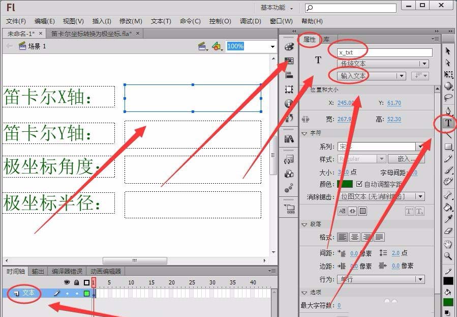 1、選擇“文本工具”在Flash舞臺繪制兩個輸入文本框,在“屬性”面板中將“實例名稱”取名為“x_txt”和“y_txt”。