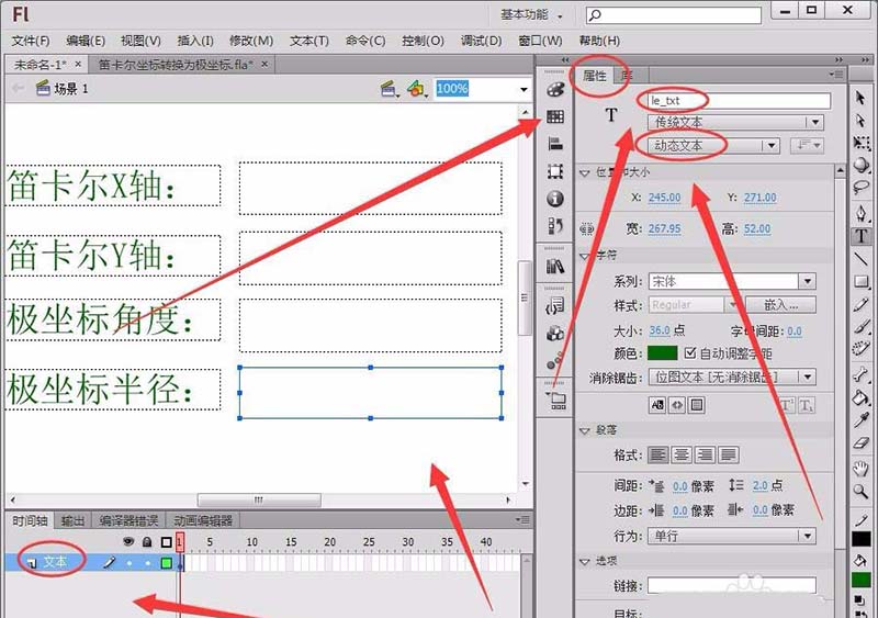 2、用上一步同樣的方法,繪制兩個動態文本框,將“實例名稱”取名為“an_txt”和“le_txt”。