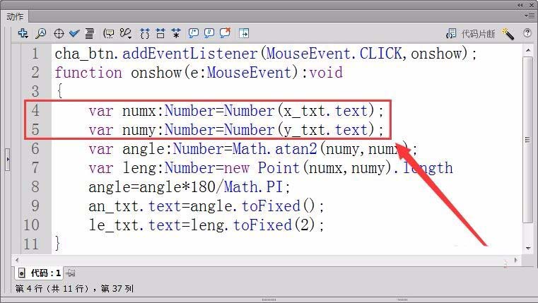 7、定義兩個實型變量numx和numy,保存舞臺輸入的笛卡爾坐標,用text屬性獲取舞臺中輸入的坐標值。