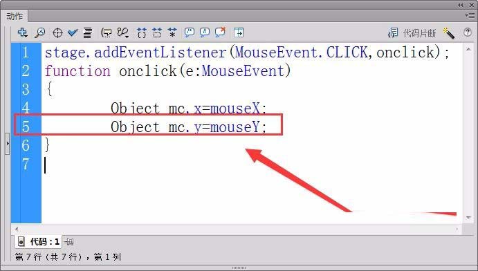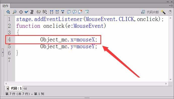7、然后,將對象Object_mc的X軸坐標設置為點擊鼠標所在的位置,用屬性mouseX獲取鼠標所在的X軸坐標。