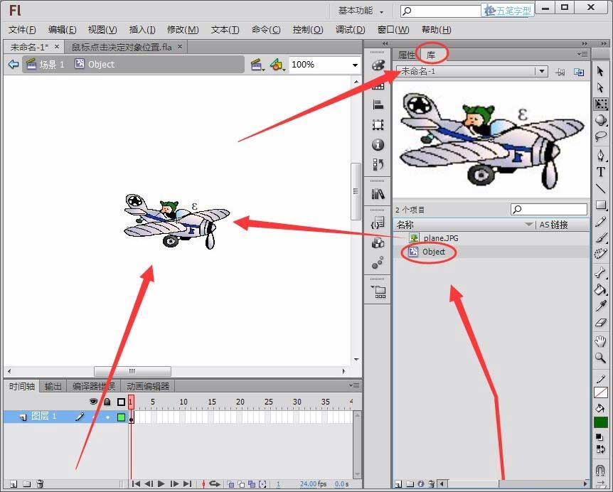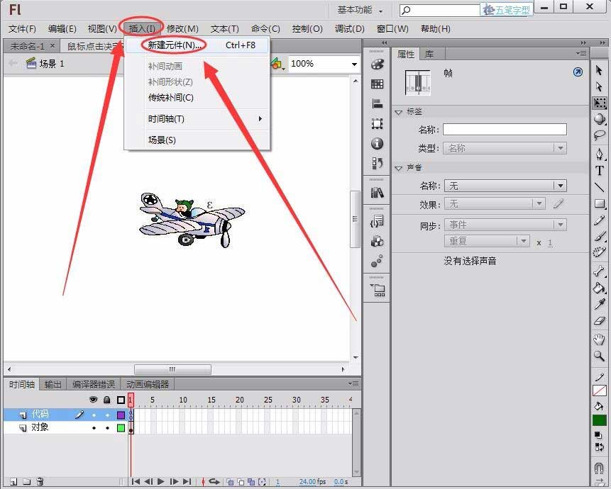 2、單擊“插入”---->“新建元件”,插入一個名為“Object”的影片剪輯元件,在元件編輯窗口插入上一步導入的圖片。