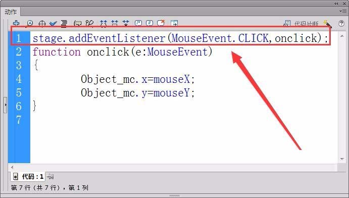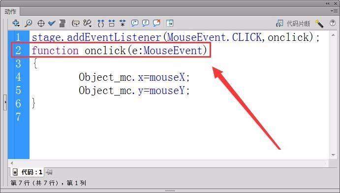 5、首先,注冊舞臺的鼠標單擊事件的偵聽器,接收者函數為“onclick”。