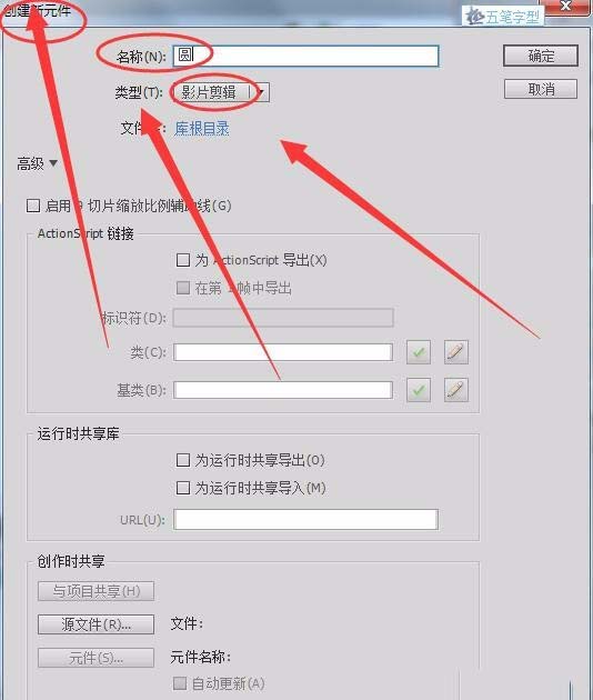 1、單擊“插入”---->“新建元件”,在出現的“創建新元件”對話框中,將“名稱”取名為“圓”,“類型”為影片剪輯,單擊“確定”。