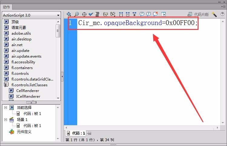3、回到場景1,將庫面板中的影片剪輯“圓”拖動到舞臺中。