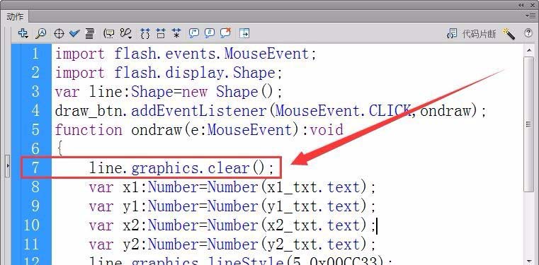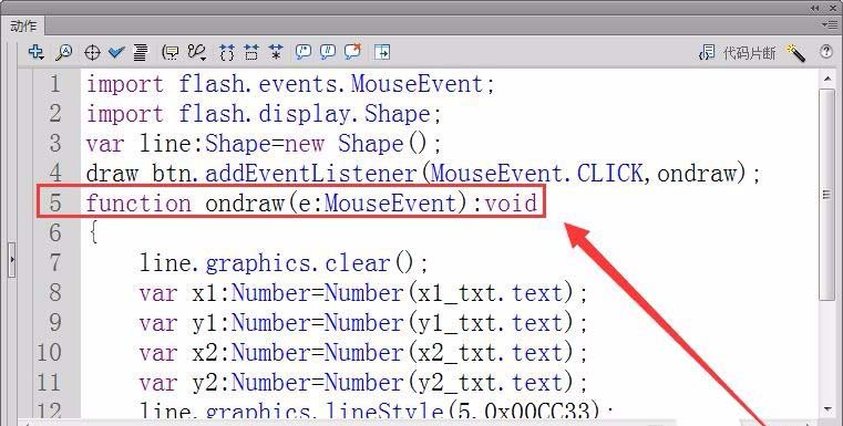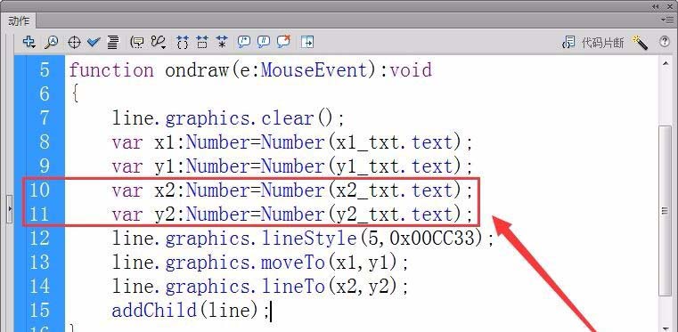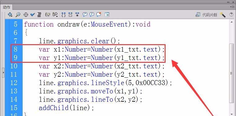 7、接著,定義實(shí)型變量x1和y1,保存直線起點(diǎn)的X軸和Y軸坐標(biāo),用text屬性從舞臺獲取坐標(biāo)值。