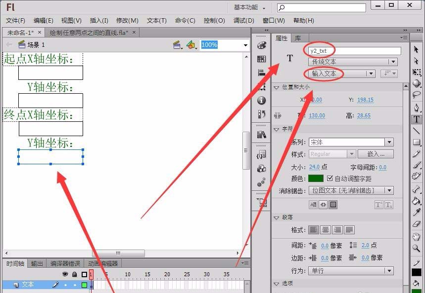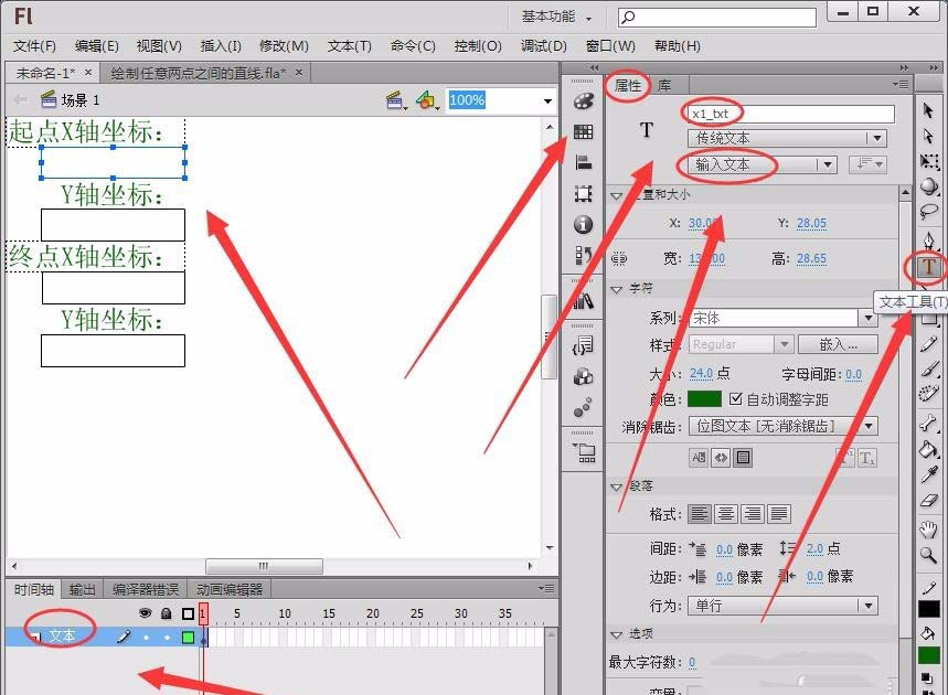 1、選擇“編輯欄”中的“文本工具”,在舞臺繪制4個輸入文本框,在“屬性”面板中將“實(shí)例名稱”分別取名為“x1_txt”、“y1_txt“、”x2_txt“和”y2_txt“。(注:要嵌入字體)