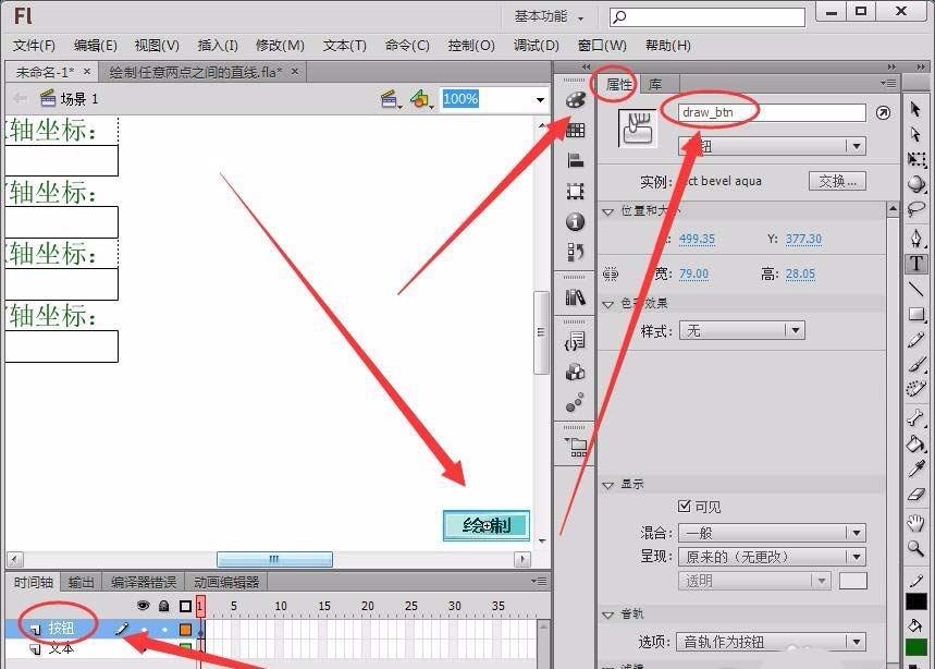 2、創(chuàng)建一個按鈕圖層,繪制一個按鈕,將“實(shí)例名稱”取名為“draw_btn”。