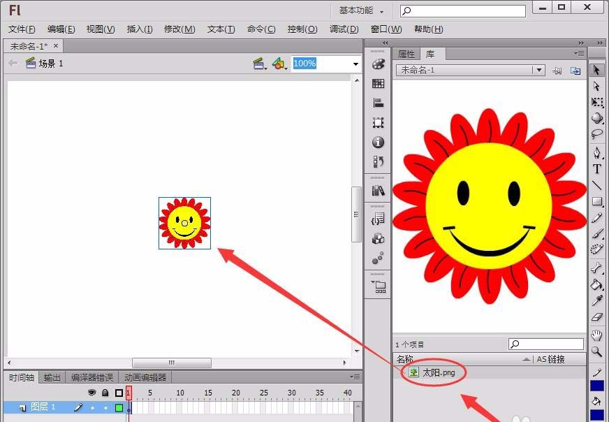 3、將“庫”面板中的圖片拖到舞臺中,并調整為合適的大小,在舞臺選中該圖片對象。