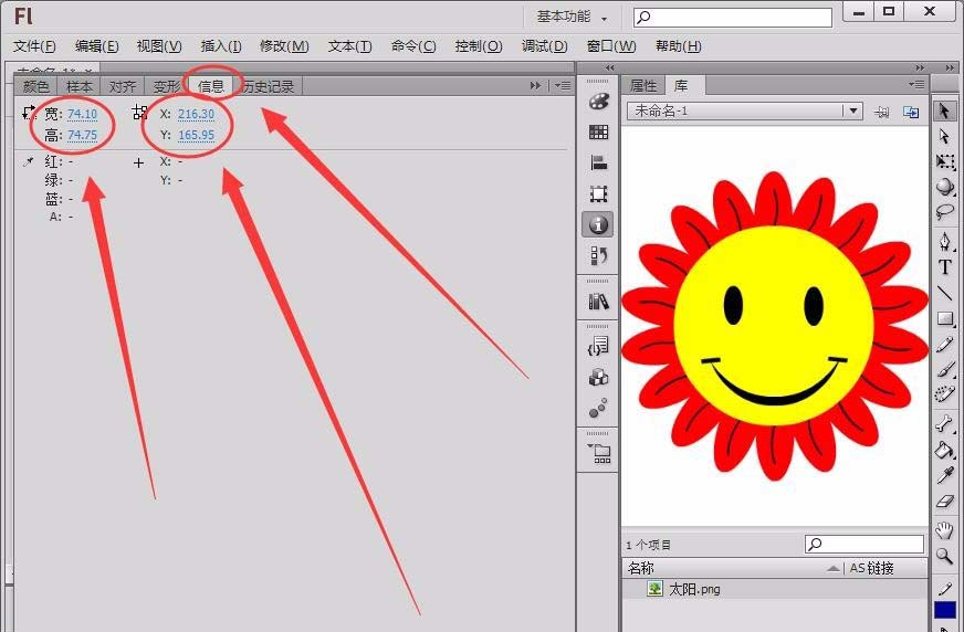 5、可以看到在“信息”面板中顯示了X和Y項,即為圖片對象的X和Y軸坐標。面板中還顯示了“寬”和“高”,即為圖片對象的寬度和高度。