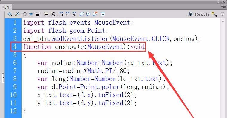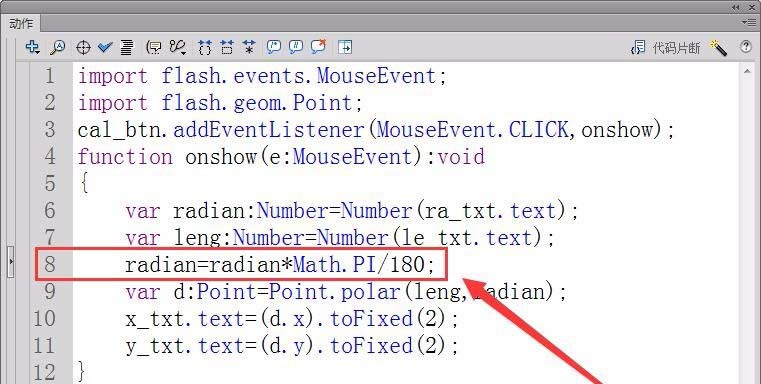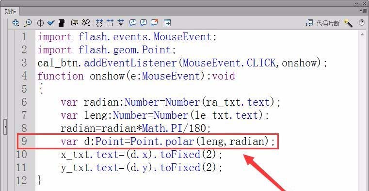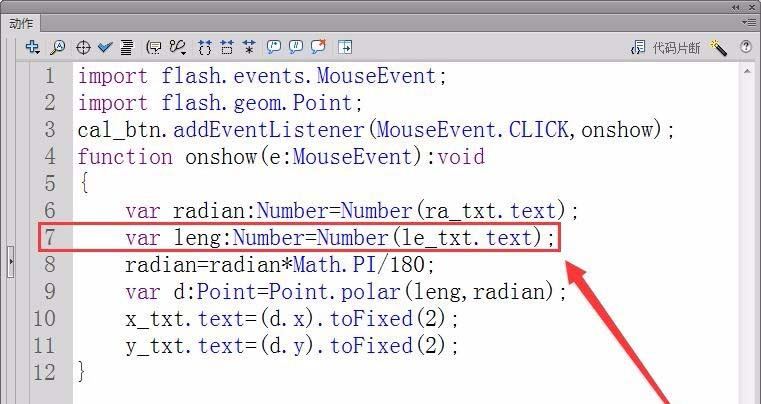 8、定義一個實型變量leng,保存極坐標的半徑,用le_txt.text屬性獲取舞臺中輸入的半徑。