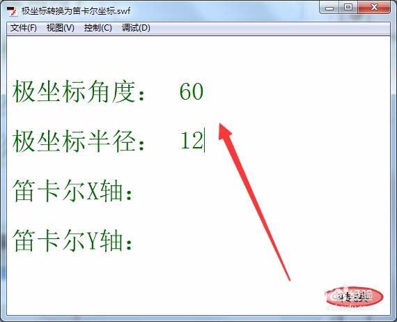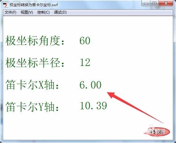 11、運行程序,在舞臺輸入極坐標后,單擊“轉換”按鈕,就輸出轉換后的笛卡爾坐標的值。