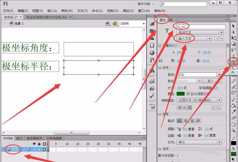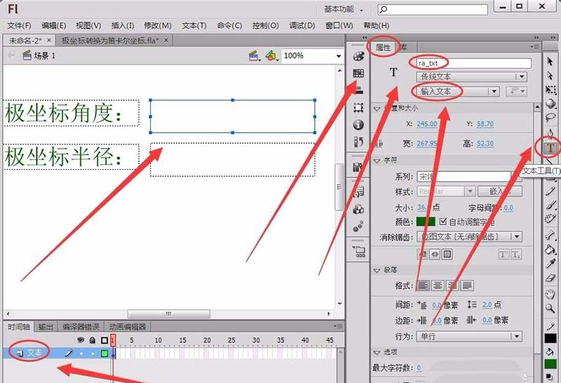 1、選擇“編輯欄”中的“文本工具”,在舞臺繪制兩個輸入文本框,在屬性面板中將“實例名稱”取名為“ra_txt”和“le_txt”。(注:要嵌入字體)