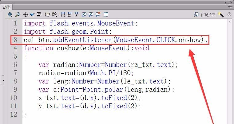 4、新建一個代碼圖層,打開“動作”面板。首先,注冊按鈕cal_btn鼠標單擊事件的偵聽器,接收者函數為onshow。