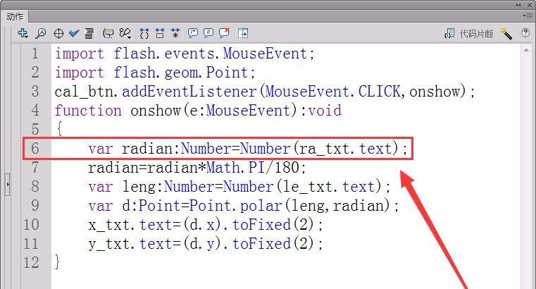 6、定義一個實型變量,用來存儲輸入的角度值,用ra_txt.text屬性獲取舞臺上輸入的角度值。