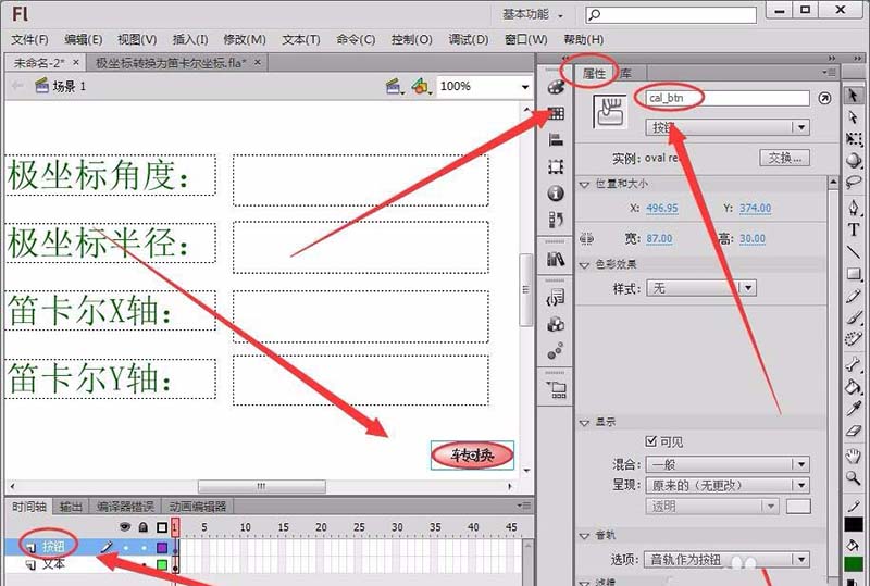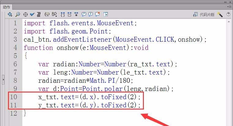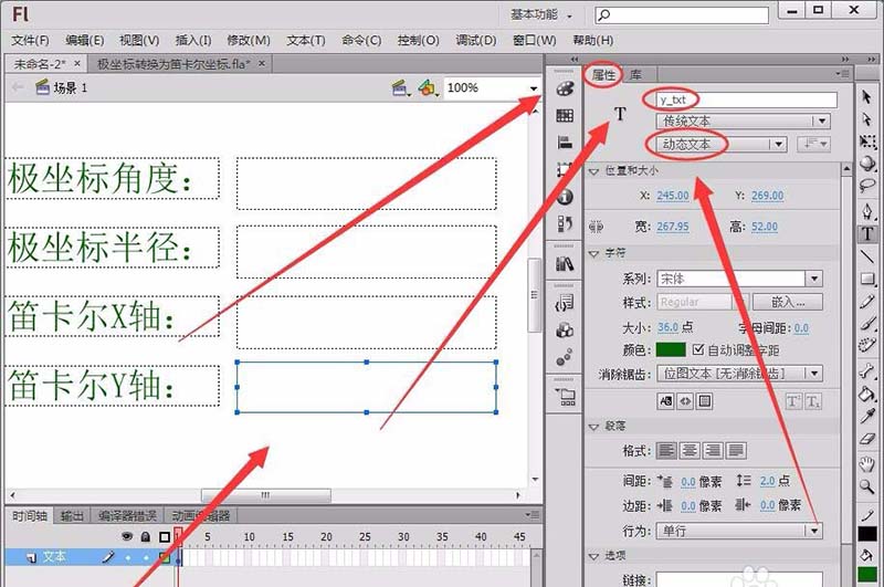 10、最后,在舞臺輸出轉換后的笛卡爾坐標,用函數toFixed保留坐標值小數點后兩位,用text屬性在舞臺輸出坐標值。