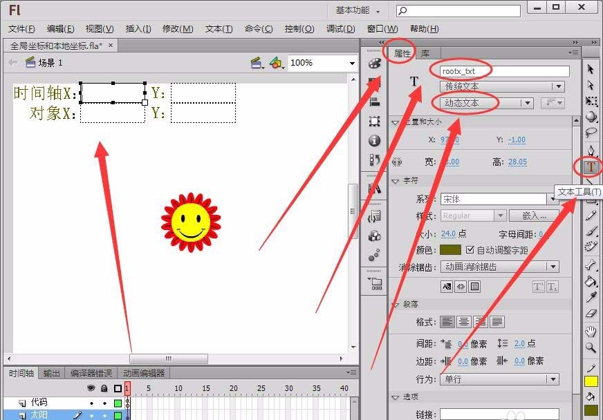 10、運行程序后,單擊太陽對象,舞臺中即輸出時間軸的坐標(0,0),以及對象的坐標(275,200)。可以看出時間軸的默認位置是在舞臺的最左上方。