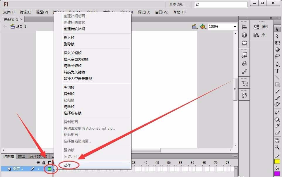 2、在需要輸入代碼的幀上右擊,在出現(xiàn)的下拉菜單中選擇“動作”選項。
