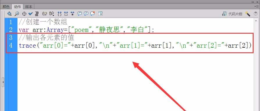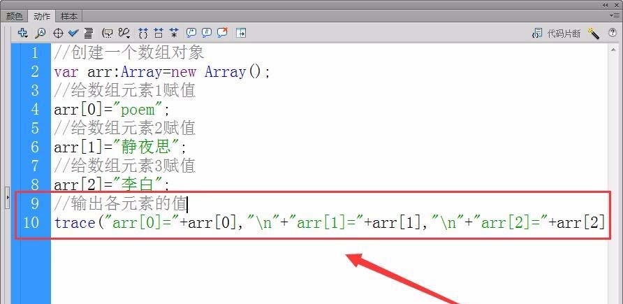 2、用trace方法輸出各數(shù)組元素的值,“動作”面板中輸入以下代碼。