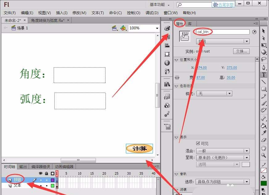 4、新建一個圖層命名為“按鈕”,插入一個按鈕元件,將元件的“實例名稱”取名為“cal_btn”。