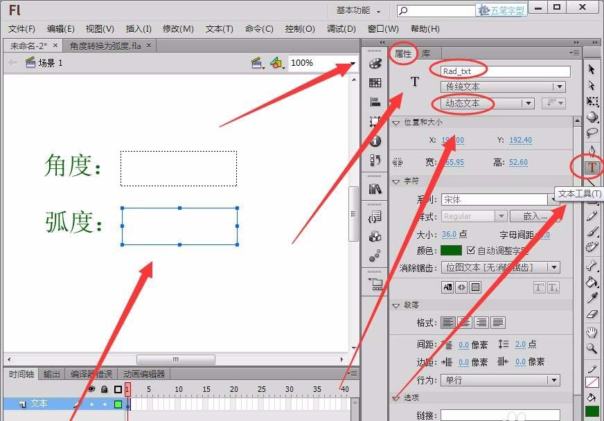 11、最后,在舞臺的動態文本框中輸出弧度值。