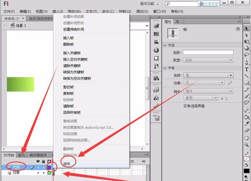 4、新建一個圖層命名為“代碼”,在圖層的第1幀右擊,選擇“動作”選項。