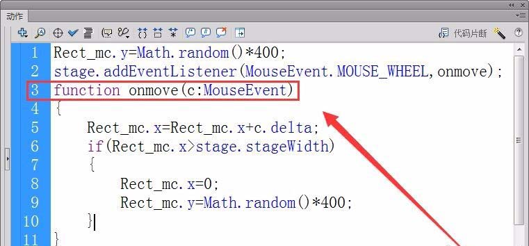 6、接著,注舞臺的滾輪事件的偵聽器,接收者函數為onmove。