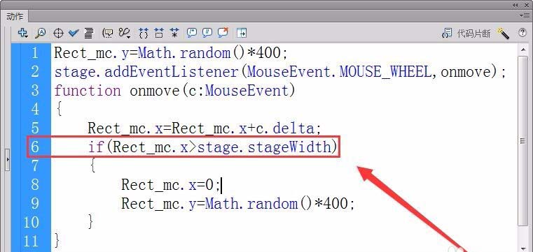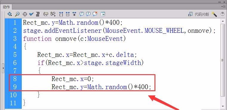 10、如果對象到達右邊界,則重置對象在舞臺上的初始坐標,X軸坐標為0,Y軸坐標為random函數產生的隨機數。