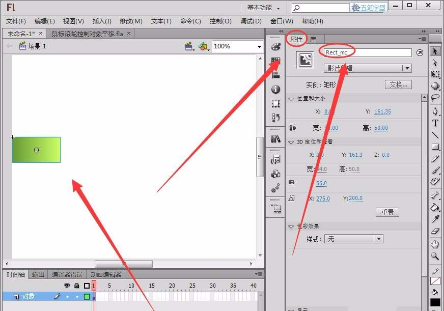 3、回到場景1,將庫面板中的矩形元件拖動到舞臺最左邊,在“屬性”面板中,將“實例名稱”取名為“Rect_mc”。