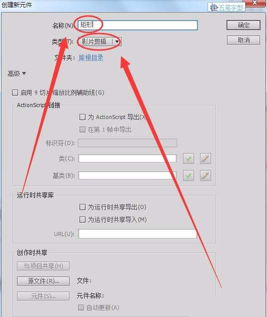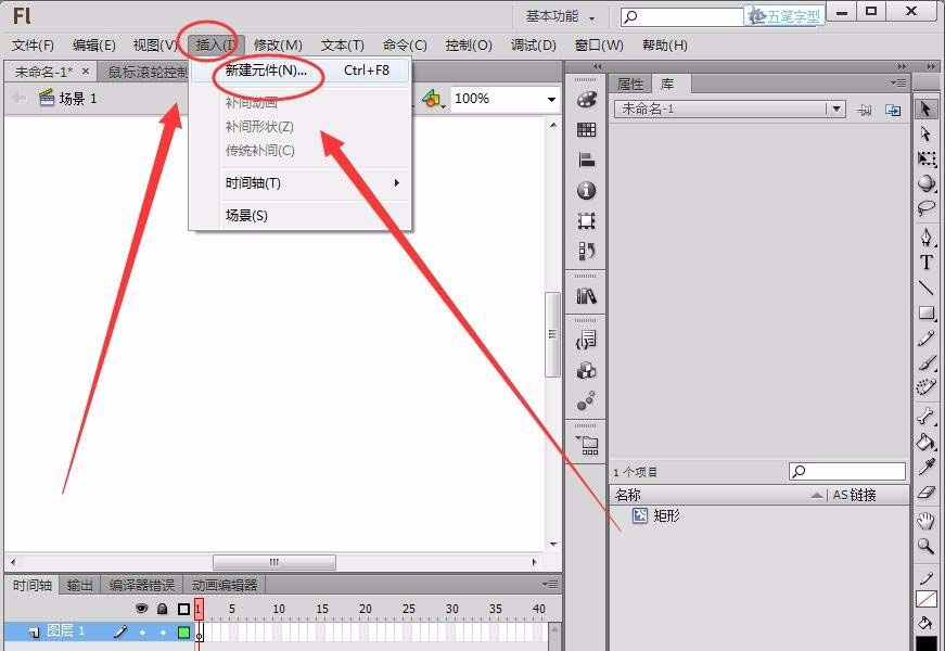 2、單擊“插入”---->“新建元件”,“名稱”取名為矩形,“類型”為影片剪輯,在元件編輯窗口繪制一個矩形。