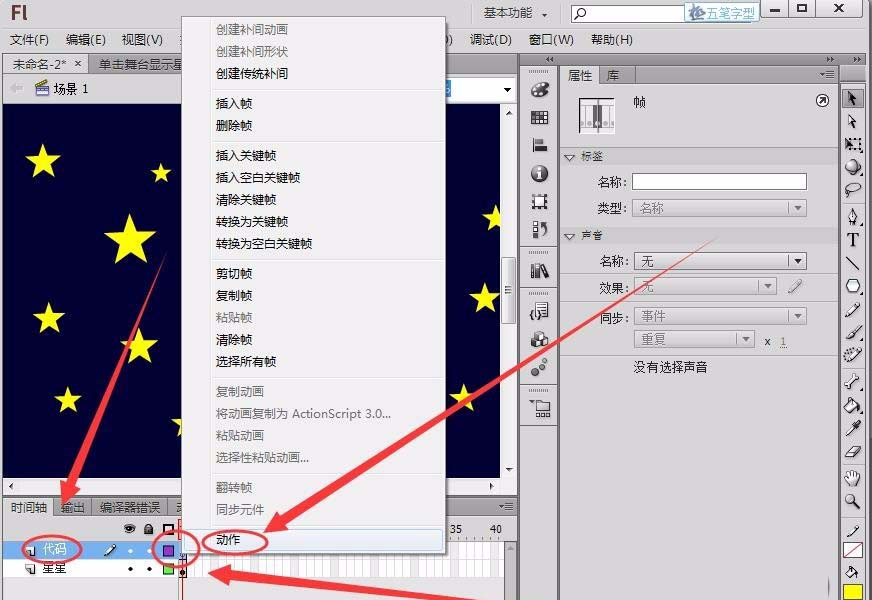 7、新建一個圖層命名為“代碼”,在圖層的第1幀右擊,選擇“動作”選項。