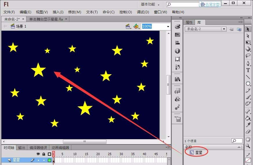 4、回到場景1,將“庫”面板中的“星星”元件拖動到舞臺中。