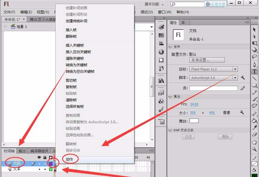 4、新建一個圖層命名為“代碼”,在圖層的第1幀右擊選擇“動作”選項。