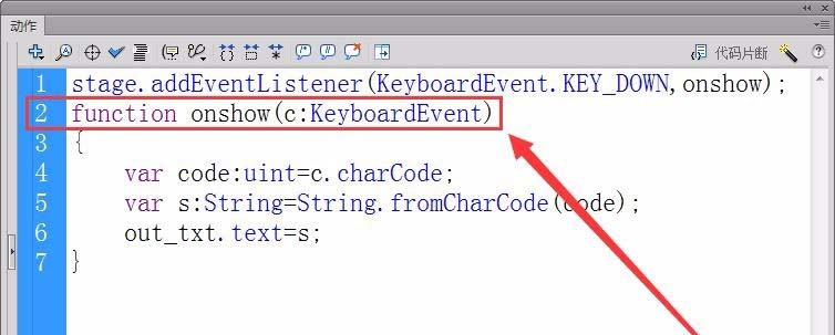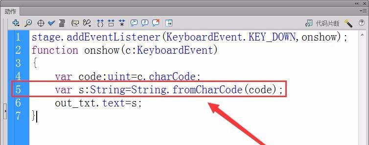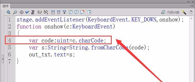 7、在函數中用charCode方法獲取按下的鍵的鍵值,定義一個變量code來保存鍵值。