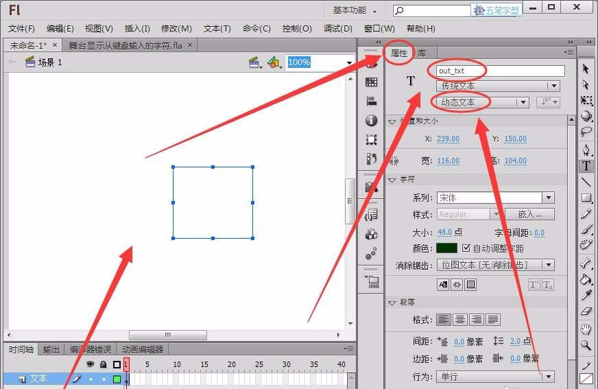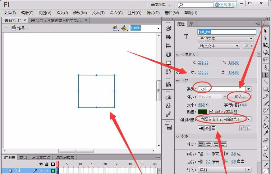 3、選擇文本框,在“屬性”面板中,將類型設置為“動態文本”,將“實例名稱”取名為“out_txt”。(注:要在“屬性”面板中要嵌入字體,運行程序后動態文本才能正常顯示)