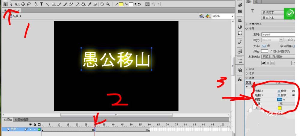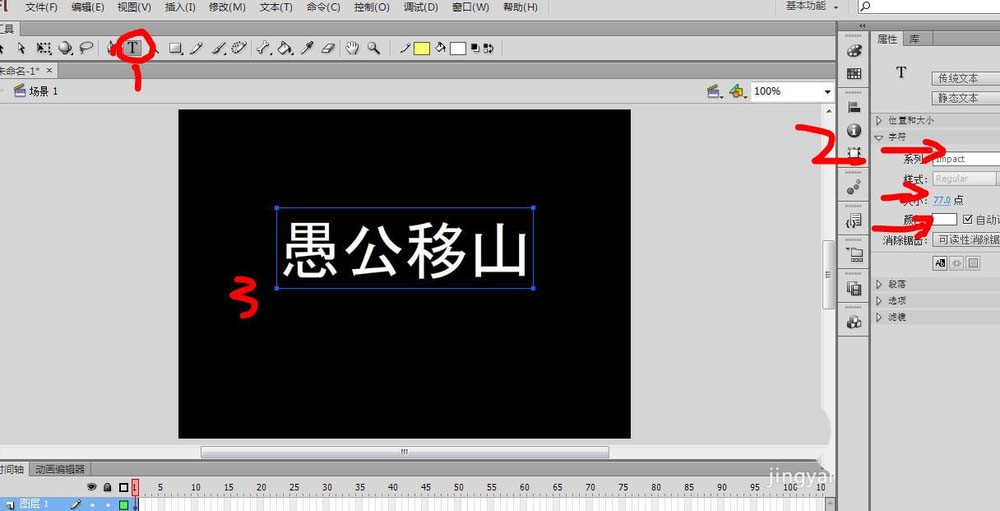 3、單擊文本工具,調成文字大小,字體,顏色等屬性,雙擊舞臺在文本框中輸入文字內容,如愚公移山.如下圖步驟所示