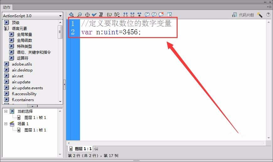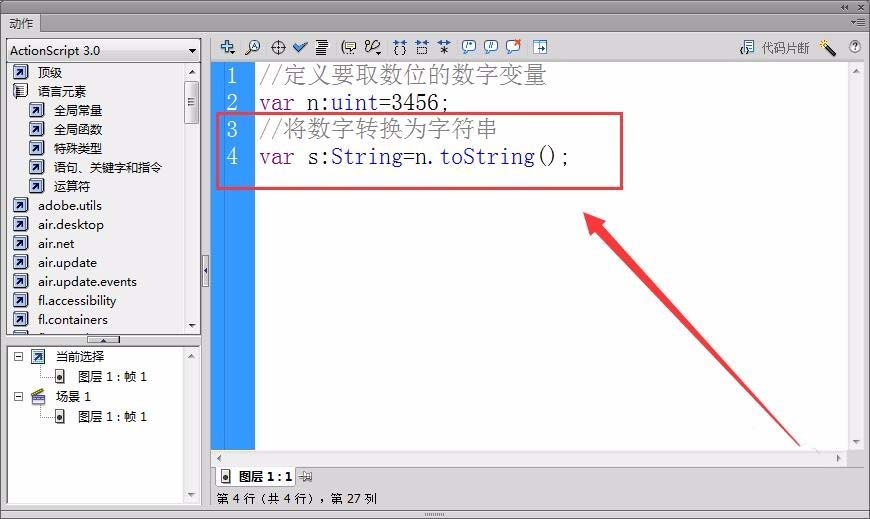 2、接著,用toString()方法將數字轉換為字符串。在“動作”面板輸入以下代碼。