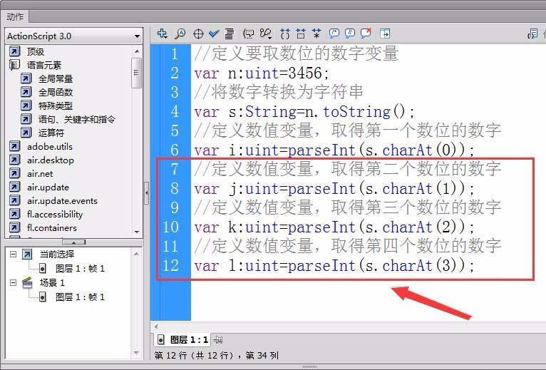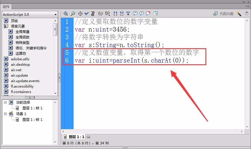 3、用CharAt()命令獲取第一個數位的字符,并用parseInt()命令轉化為數值。“動作”面板的代碼如下圖所示。