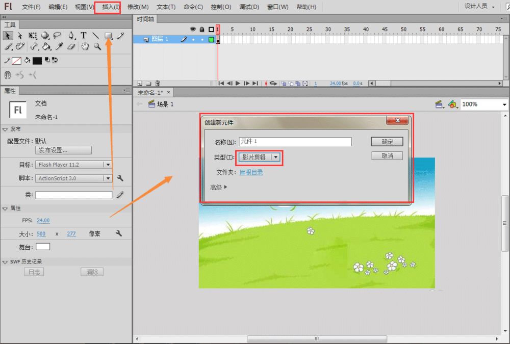 3、點擊【插入】然后【件新元件】,選擇【影片剪輯】,點擊確定