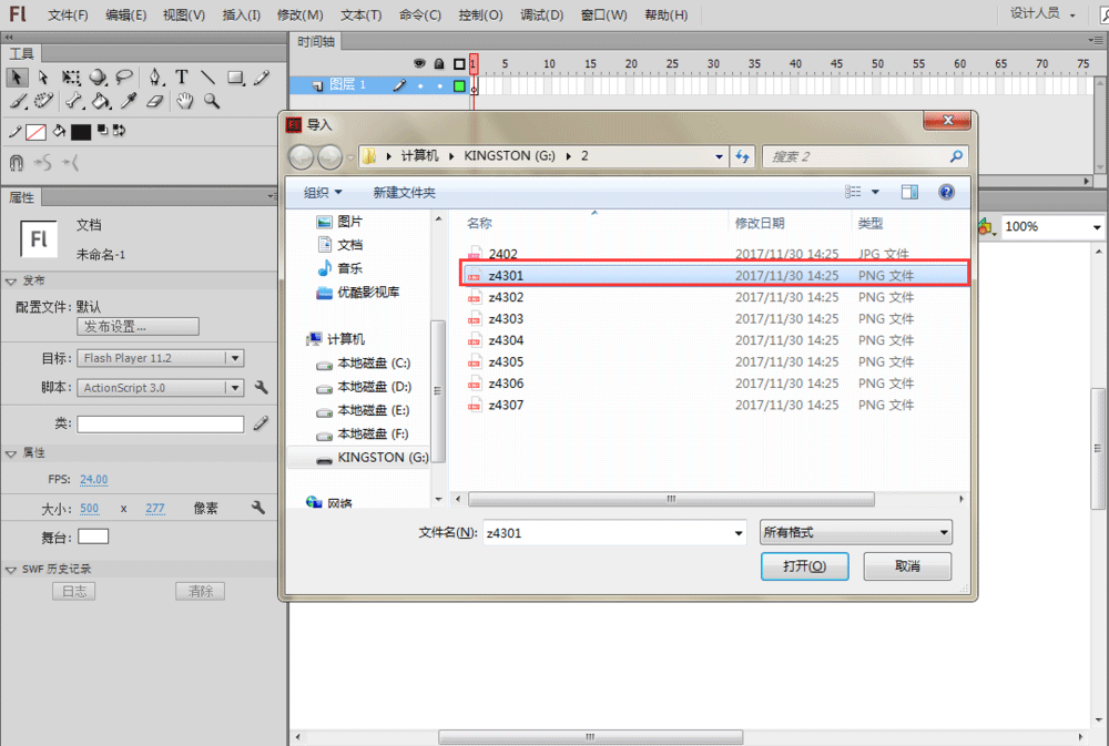 4、同樣的,點擊【文件】-【導入】-【導入到舞臺】,點擊小松鼠系列動作圖片的第一張圖片,點擊【打開】最后點擊【是】