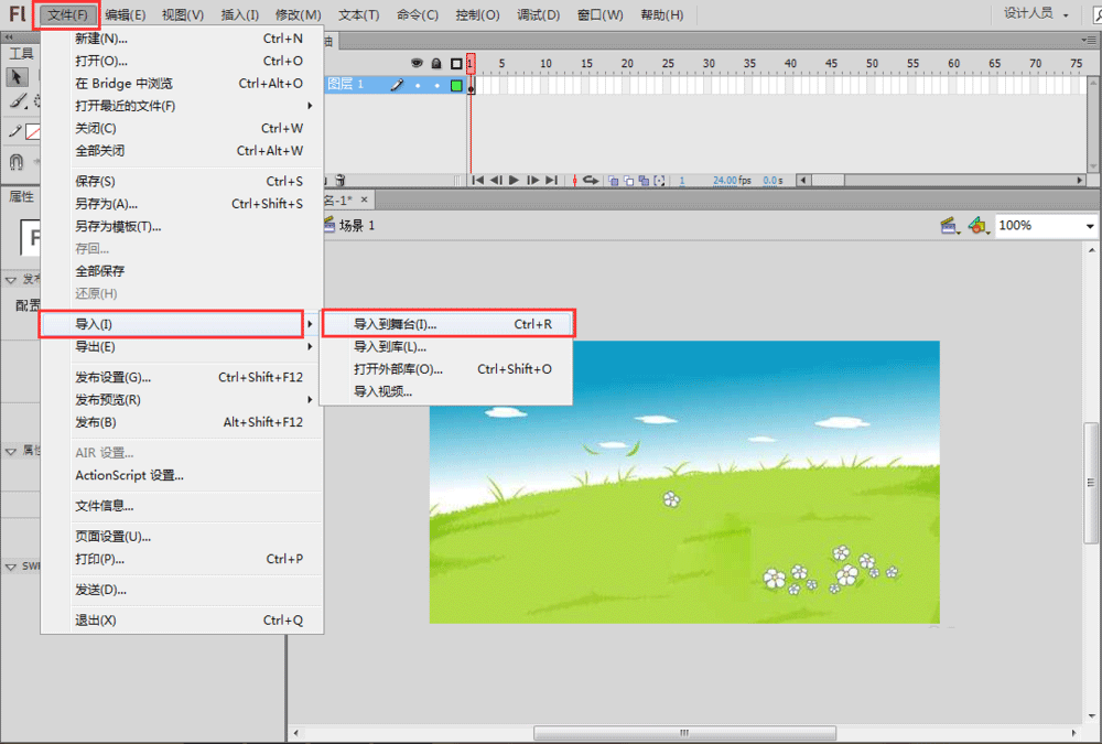 2、打開【文件】點擊【導入】-【導入到舞臺】,將背景圖片導入進去。