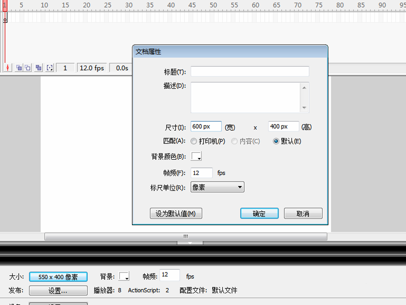 1、首先啟動flash8,新建一文檔,設置大小為600*400,背景顏色為白色,幀頻為12fps。
