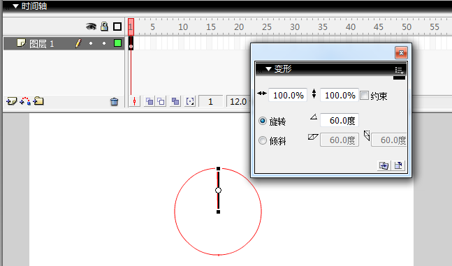 5、單擊時間軸上的第二幀,按F6鍵,插入一個關鍵幀,然后利用任意變形工具,延順時針旋轉15°,反復進行這樣的操作,直到第13幀。