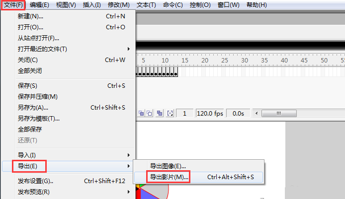8、最后,講一下如何保存。單擊文件---導出,選擇導出影片,格式可以選swf,也可以選其他視頻格式。然后保存。這樣一個美麗的七色彩輪就制作好了。