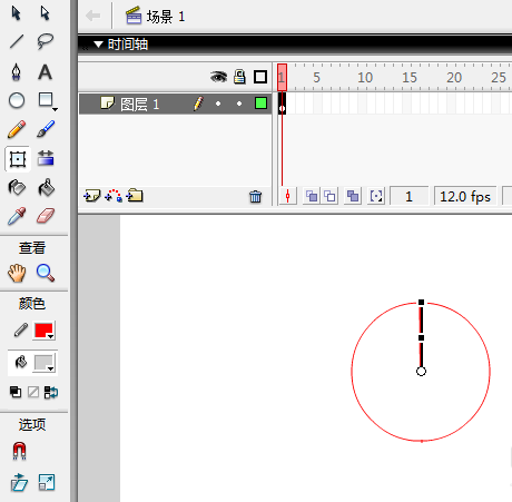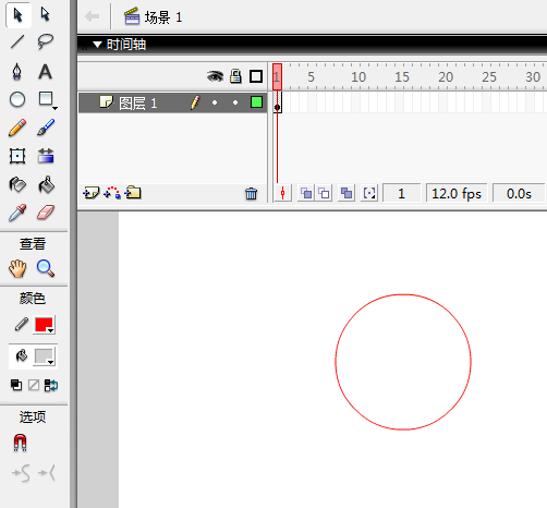 1、開啟flash程序,新建一個flash文檔。單擊橢圓工具,筆觸顏色設置為紅色,填充色無色。按住shift鍵,在舞臺上畫出一個正圓,調整圓心使它位于舞臺中心。
