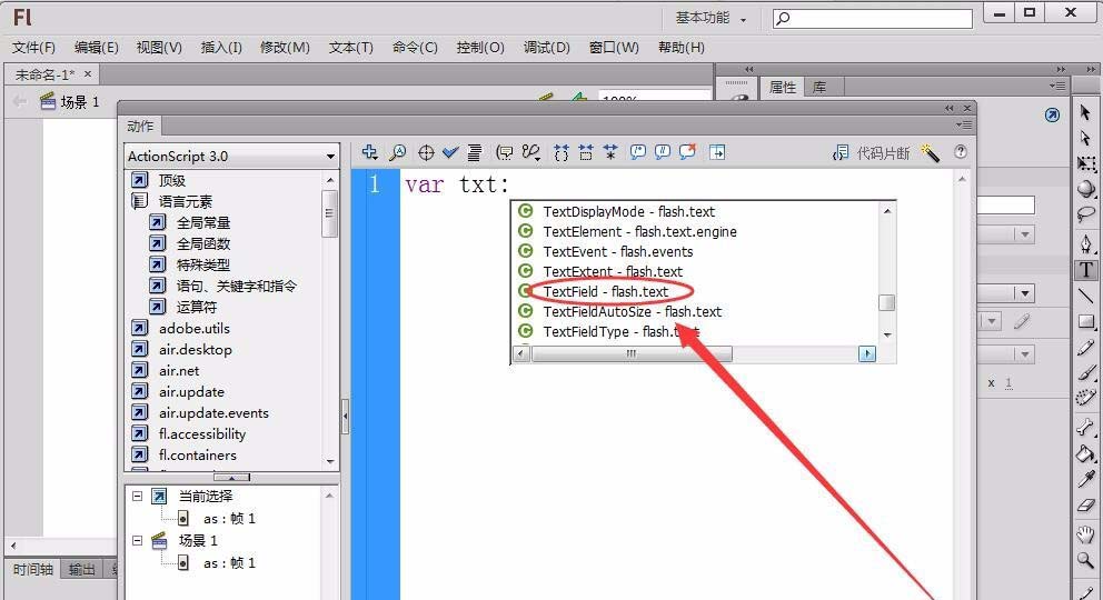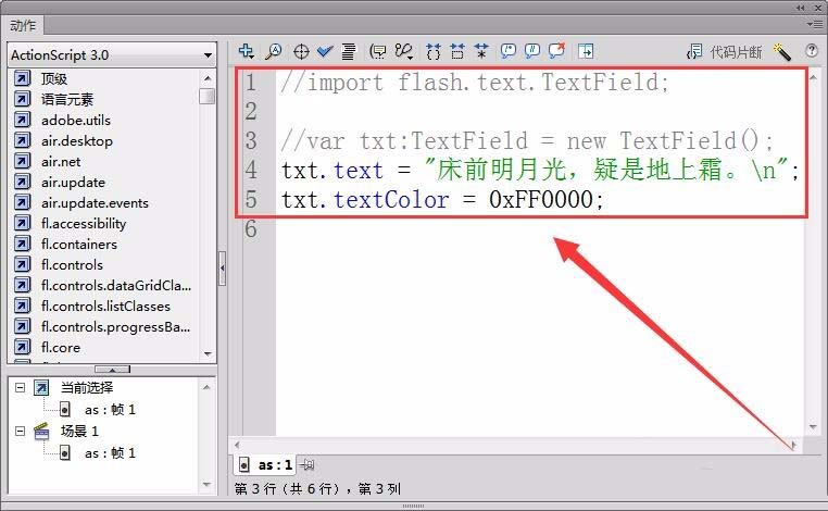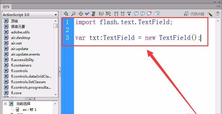 注:FlashCS6想要出現(xiàn)代碼提示,一定要先定義變量的類,例如語句“var txt:TextField=new TextFlie()”。