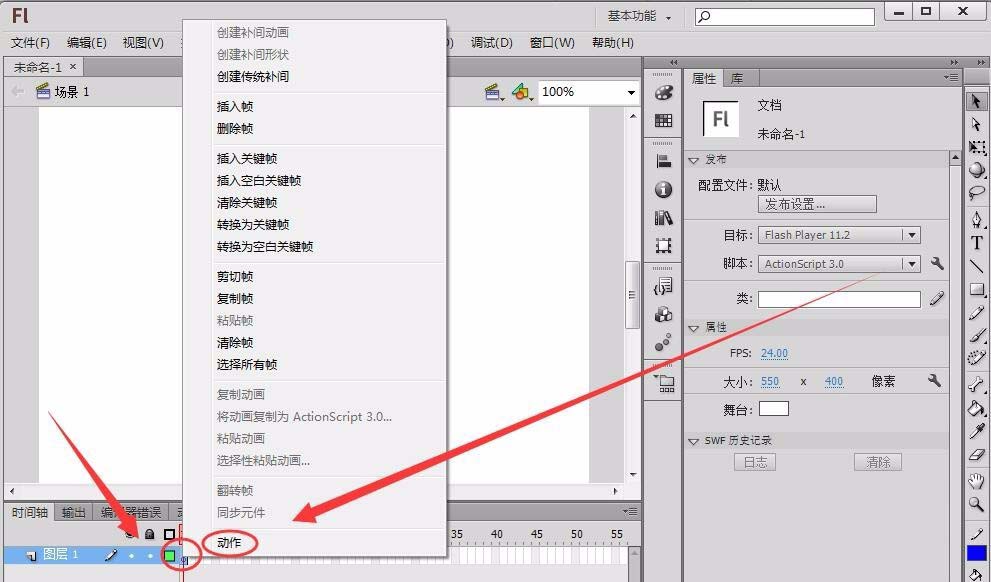 3、在要輸入代碼的幀上右擊,選擇“動作”。