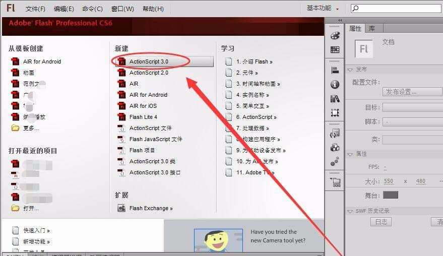 2、單擊“ActionScript3.0”,新建一個空白文檔。