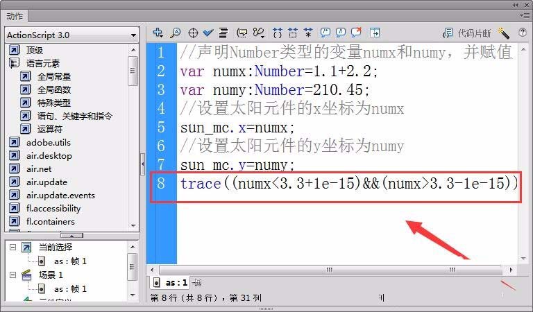 10、Flash中,對(duì)于浮點(diǎn)數(shù),不能用“==”判斷兩個(gè)數(shù)是否相等,如果是循環(huán),要用大于、小于。如果一定要判斷浮點(diǎn)數(shù)相等的話,要求兩數(shù)之間差別很小,而不是相等,應(yīng)寫成如下形式。