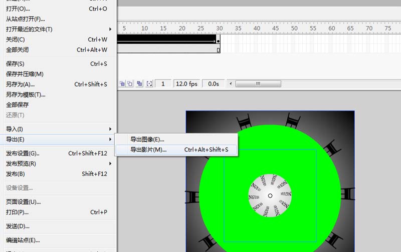 8、在圖層230幀處插入關鍵幀,并將元件2擴大,在1-30幀處創建補間動畫。執行文件-導出-導出影片命令,將文件導出為gif文件。