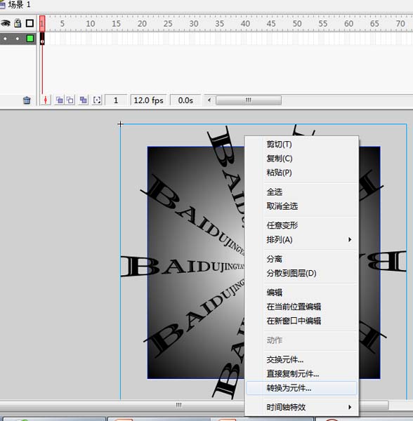 5、將文字轉換為圖形元件,設置左對齊,垂直中齊,選擇任意變形工具,將中心點移動到舞臺中心。